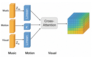 are jointly constructed from action and visual features [10]. The attention matrix maps the correspondence between musical rhythm phase, action kinetic intensity, and visual style parameters, and is written into the latent space update path within the generator as a temporal slice.