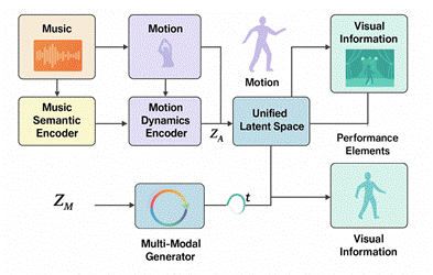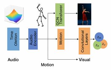 The model adopts a hierarchical cross-modal generative architecture, as shown in Figure 1, comprising a music semantic encoder, motion dynamics encoder, visual style encoder, unified latent space mapper, and multimodal generator.The music encoder employs a multi-scale convolutional and stacked Transformer architecture to generate temporally aligned embedding sequences based on beat density, timbre texture, and frequency band energy distribution. The motion encoder takes 3D trajectory data of skeletal keypoints as input, utilizing GCN and temporal self-attention modules to extract displacement gradients, angular velocity, and kinetic energy features.The visual encoder builds upon a convolutional style extractor and color space decomposition module to form a style vector containing hue, illumination distribution, and texture field information [2]. The three encoded vectors are compressed into a shared latent space Z via a unified mapper. Orthogonal constraints maintain cross-modal independence, while synergistic correlation constraints reinforce the correspondence between rhythm peaks, motion amplitude, and visual style.The multimodal generator is implemented via a conditional diffusion network, employing music embeddings as primary control conditions. It dynamically adjusts noise reconstruction paths during diffusion inversion by integrating motion priors and visual style vectors [3]. The generation process executes in time slices: first solving beat-driven coarse motion sequences, then introducing a refinement module guided by visual style to jointly generate stage-level expressive elements, achieving a structured, controllable cross-modal generation pipeline.